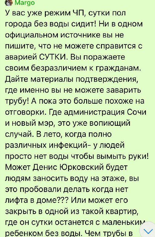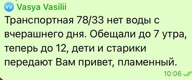 Сегодня утром редакция Сочи24 опубликовала статью, в которой рассказала о том, что некоторые жители Хостинского района по-прежнему остаются без воды, хотя им обещали устранить неполадки к 7:00 (этого дня).